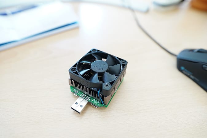 Wir verwenden eine Testladung mit integriertem Lüfter und externer Stromversorgung. Das ist wichtig: Günstigere Testladungen ohne eigene Stromversorgung beziehen den Strom für ihre Elektronik und den Lüfter direkt aus der Powerbank und verfälschen so die Messung. Unsere Testladung zieht ihren eigenen Betriebsstrom aus einem separaten Netzteil. So messen wir nur die Energie, die tatsächlich an ein Endgerät gehen würde.