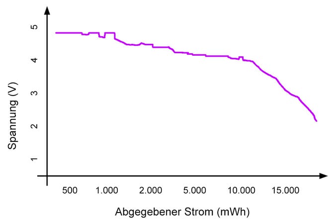 Das Diagramm zeigt den typischen Spannungsverlauf bei der Entladung. Du siehst, wie die Spannung zunächst stabil bei ca. 5 Volt liegt und dann ab etwa 10.000 mWh (bei einer 20.000 mAh Powerbank) langsam abfällt. Der steile Abfall am Ende markiert den Punkt, an dem die Powerbank die Ausgabe einstellt.